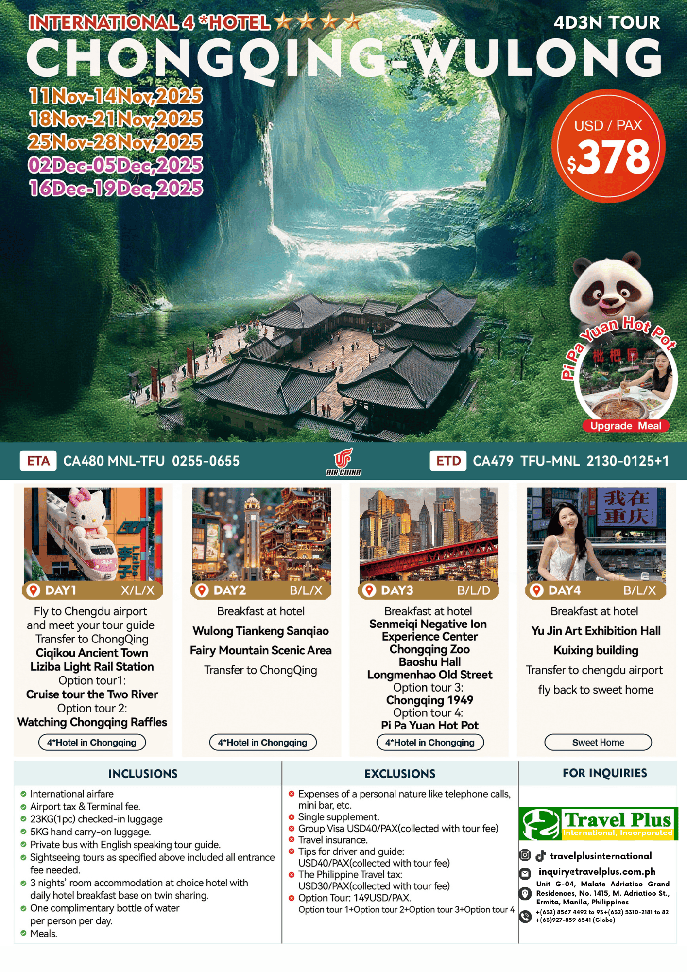 • Travel Plus International will not be held responsible for sudden changes and or closure of operating hours of said places included in the itinerary. Options and alternatives will be discussed accordingly.