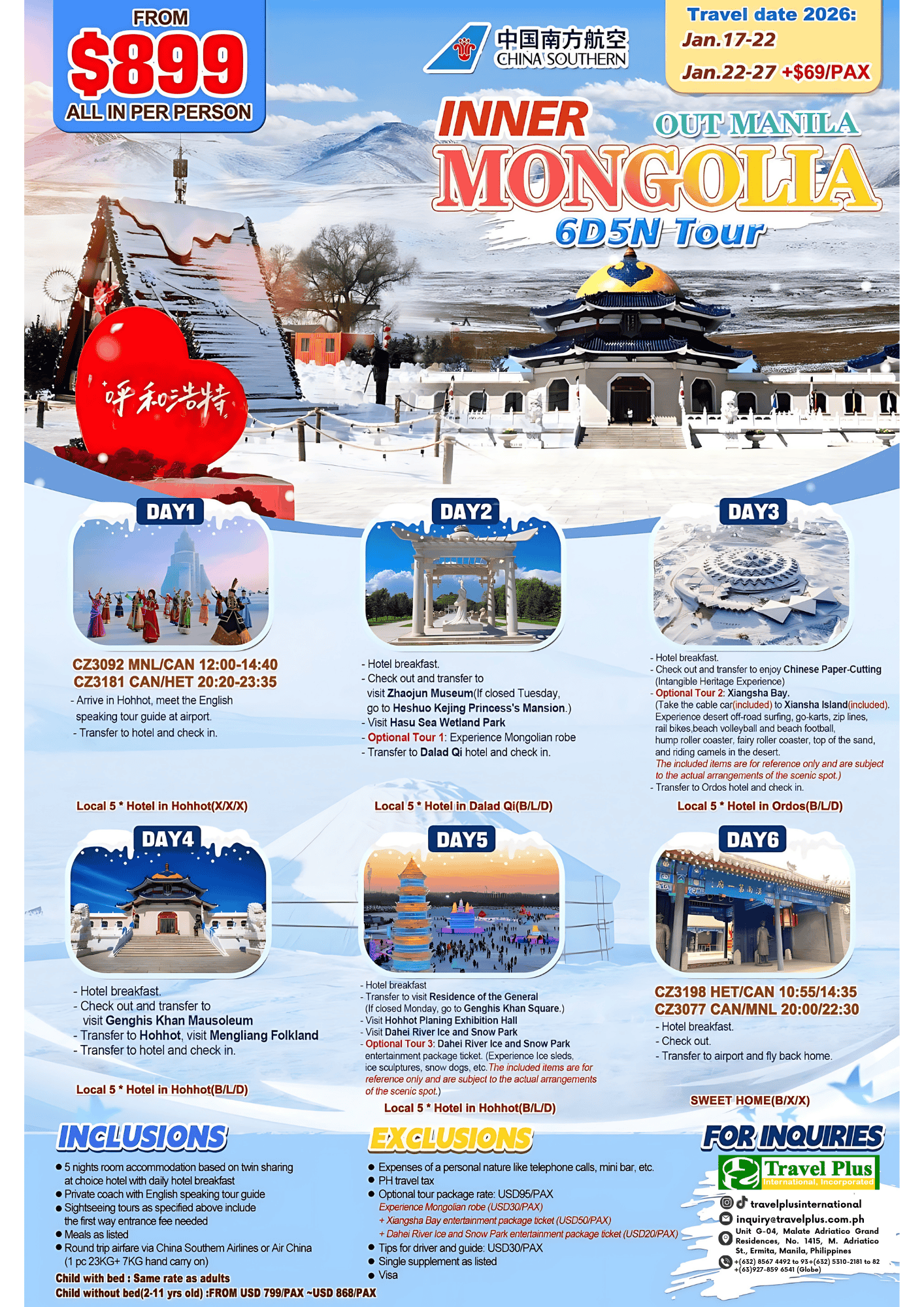 • Travel Plus International will not be held responsible for sudden changes and or closure of operating hours of said places included in the itinerary. Options and alternatives will be discussed accordingly.