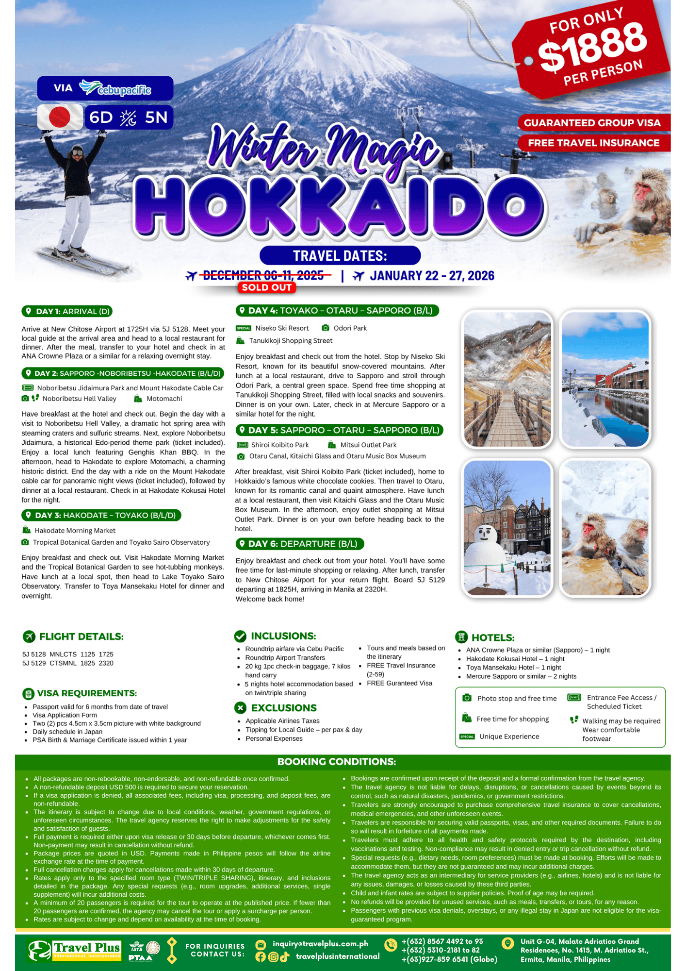• Travel Plus International will not be held responsible for sudden changes and or closure of operating hours of said places included in the itinerary. Options and alternatives will be discussed accordingly.