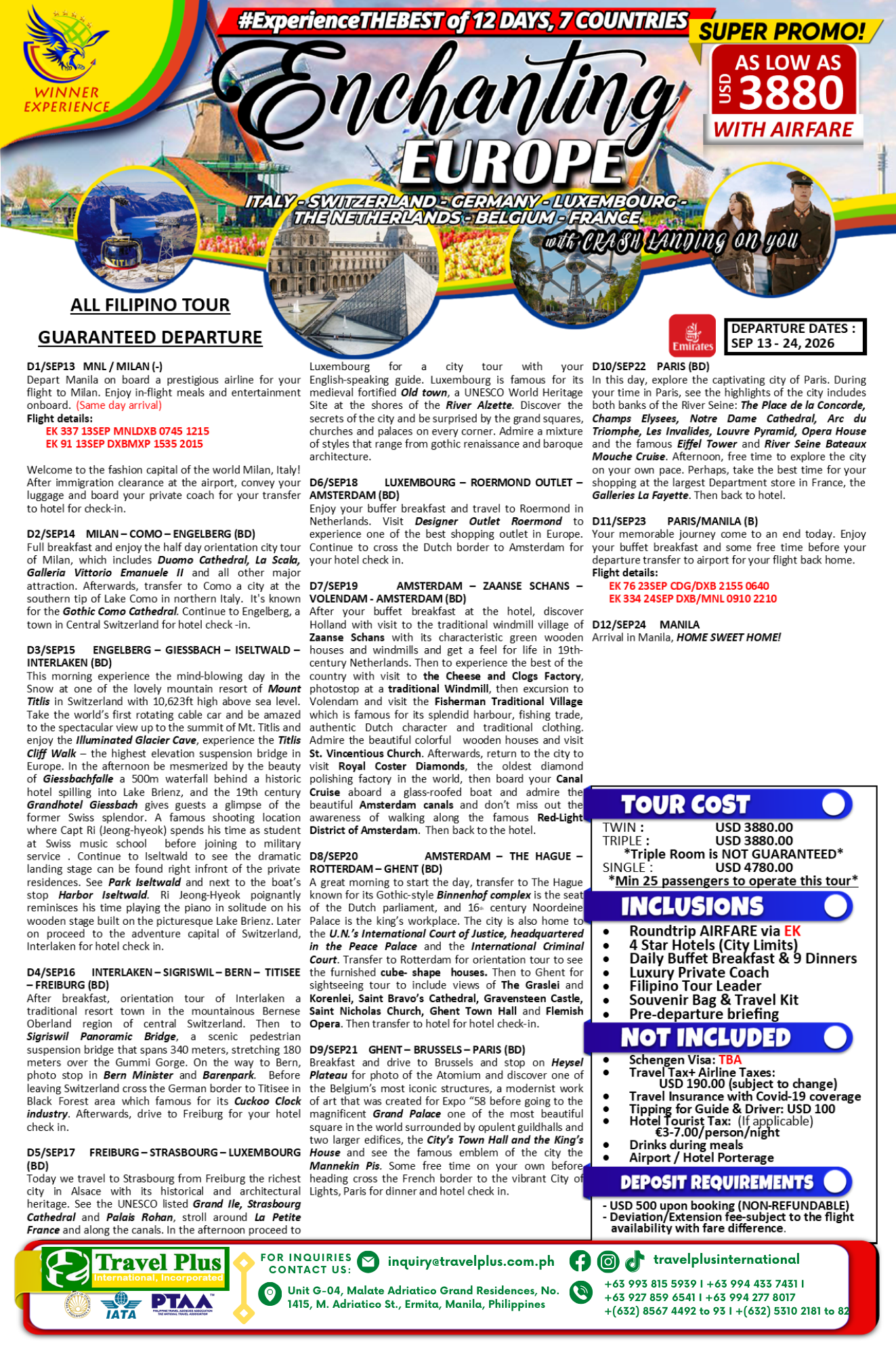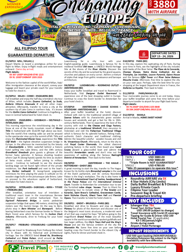 Yes, Filipino citizens require a visa to enter the country. Travelers are responsible for securing valid passports, visas, and other required documents. Failure to do so will result in forfeiture of all payments made.