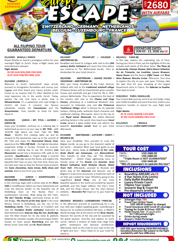 Yes, Filipino citizens require a visa to enter the country. Travelers are responsible for securing valid passports, visas, and other required documents. Failure to do so will result in forfeiture of all payments made.