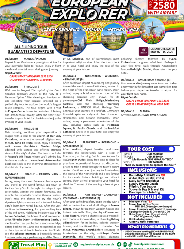 Rates apply only to the specified room type (TWIN/TRIPLE SHARING), itinerary, and inclusions detailed in the package. Any special requests (e.g., room upgrades, additional services, single supplement) will incur additional costs.