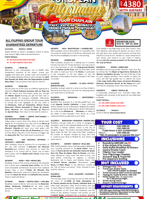 Yes, Filipino citizens require a visa to enter the country. Travelers are responsible for securing valid passports, visas, and other required documents. Failure to do so will result in forfeiture of all payments made.